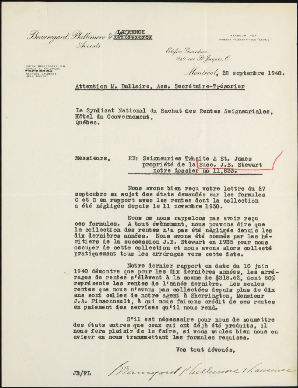 Succession J. B. Stewart, seigneuries de Twhaite et Saint-James, 1935-1940, Archives nationales à Québec, Fonds Syndicat national du rachat des rentes seigneuriales, (03Q,E39,S100,SS2,D260).