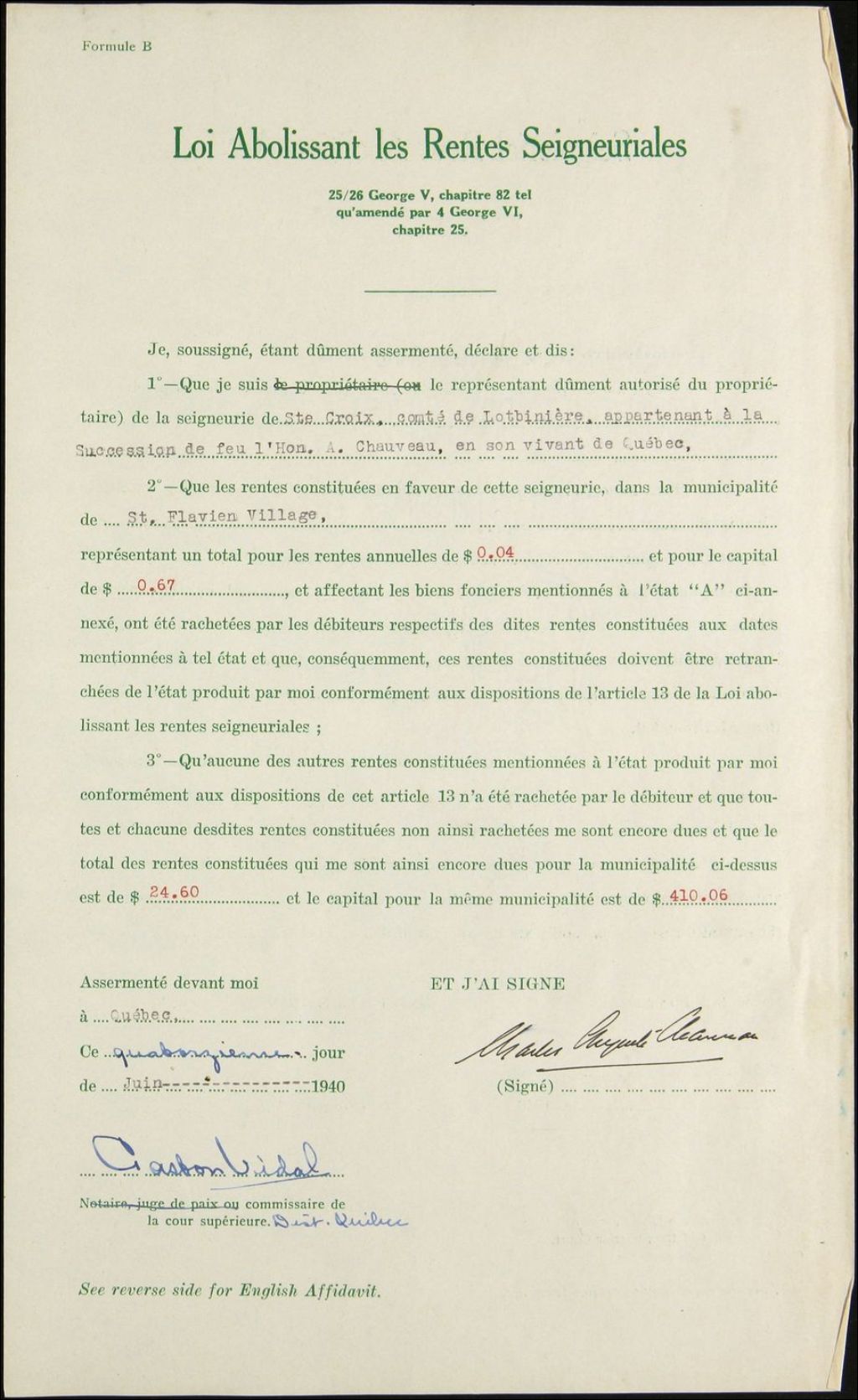 Succession Honorable A. Chauveau, seigneurie de Sainte-Croix, 1935-1940, Archives nationales à Québec, Fonds Syndicat national du rachat des rentes seigneuriales, (03Q,E39,S100,SS2,D46).