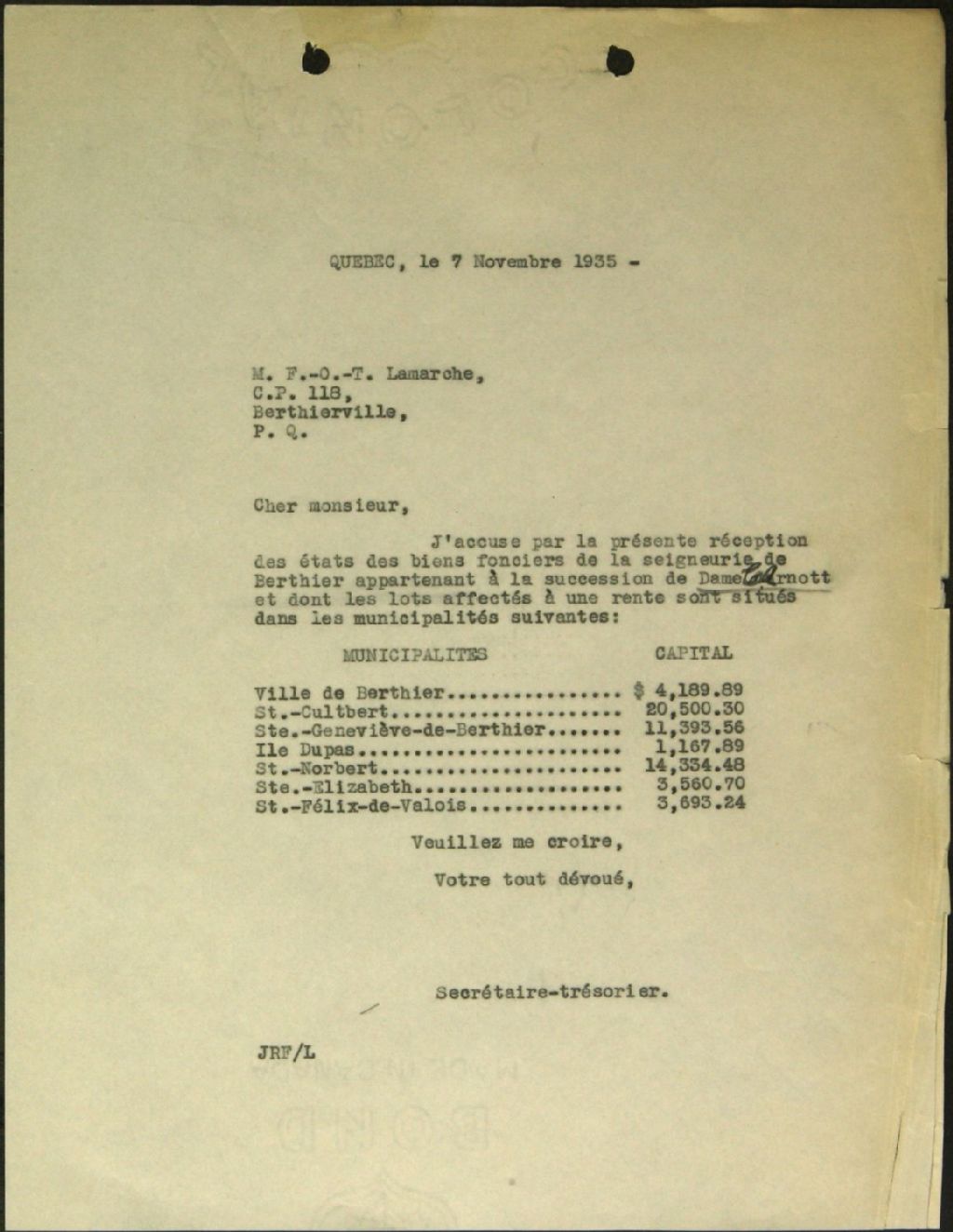 - Succession de dame C. Arnott, seigneurie de Berthier