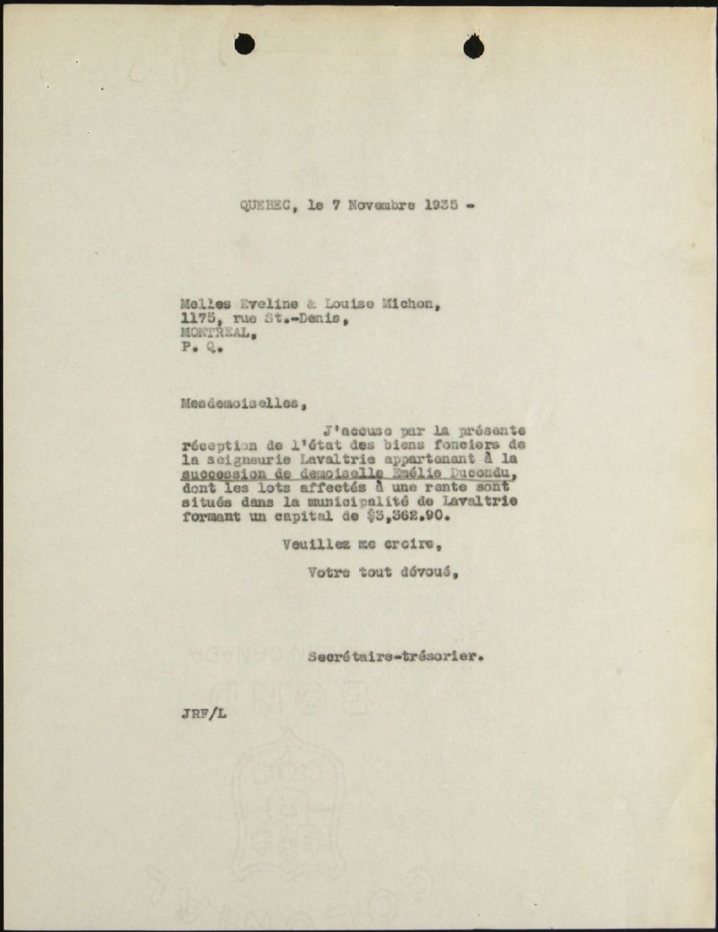 Succession Emélie Ducondu, seigneurie de Lavaltrie