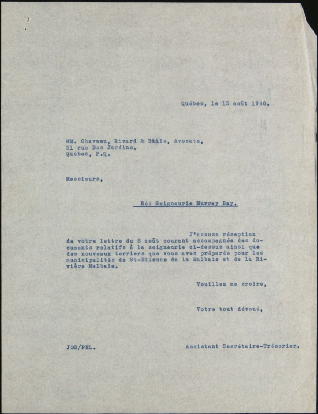 Succession Dugan, seigneurie de Murray Bay, 1935-1940, Archives nationales à Québec, Fonds Syndicat national du rachat des rentes seigneuriales, (03Q,E39,S100,SS2,D98).