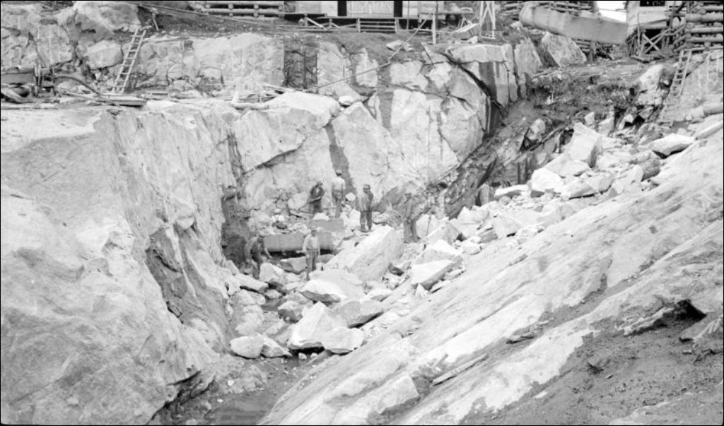 Construction de la passe dangereuse; faille sous la section 11, 1942, Archives nationales à Québec, Fonds Ministère de l'Environnement et de la Lutte contre les changements climatiques, (03Q,E57,S44,SS1,D75,P60-3), Photographe non identifié.