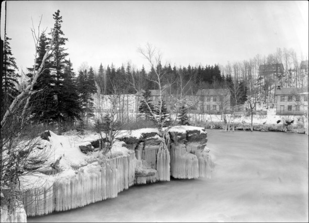 Rivière Ouiatchouane à Val-Jalbert, 1925, Archives nationales à Québec, Fonds Ministère de l'Environnement et de la Lutte contre les changements climatiques, (03Q,E57,S44,SS1,D92,PA14-12), Photographe non identifié.