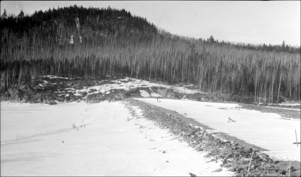 Lac Kénogami, construction des barrages Pibrac et des digues: Baie Moncouche, vue du remblai