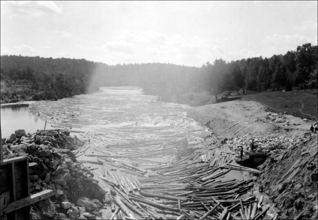 Rivière du Lièvre: Construction du réservoir Rapide des Cèdres, amoncellement de billots dans le canal de dérivation en amont du barrage