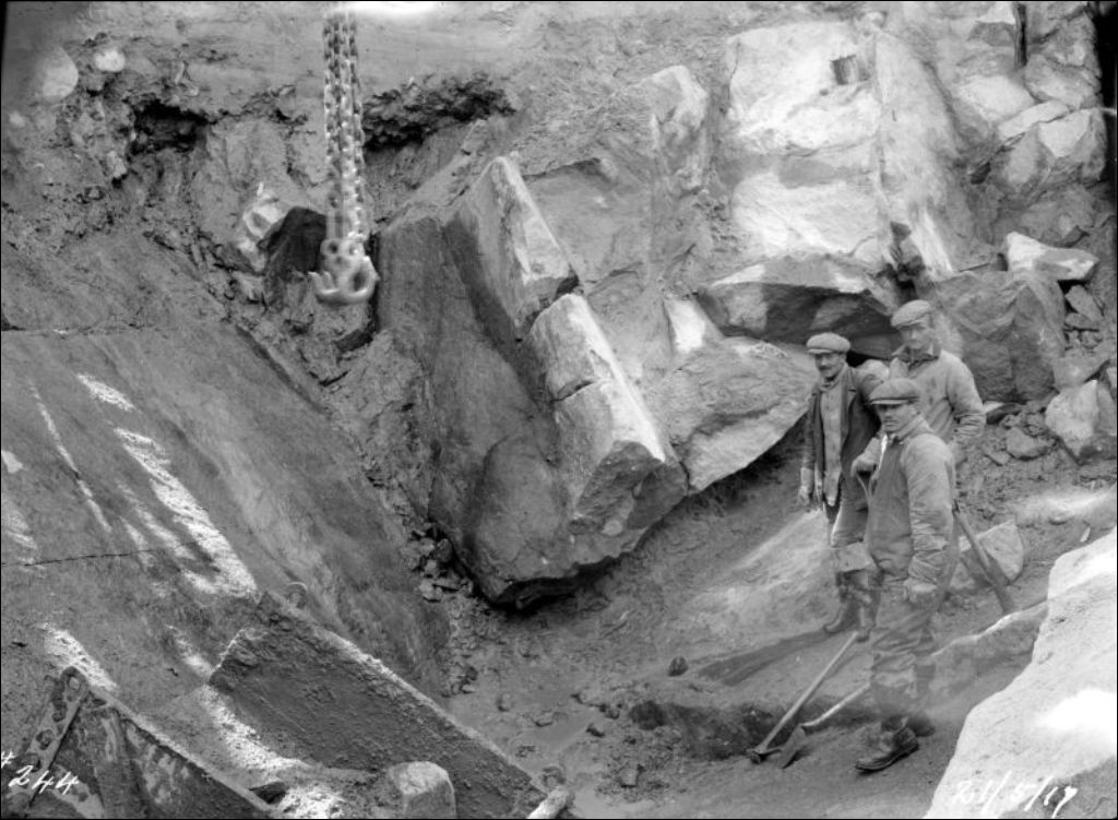 Rivière Saint-Maurice, construction du barrage Gouin; Showing two sand seam under backing rock at toe