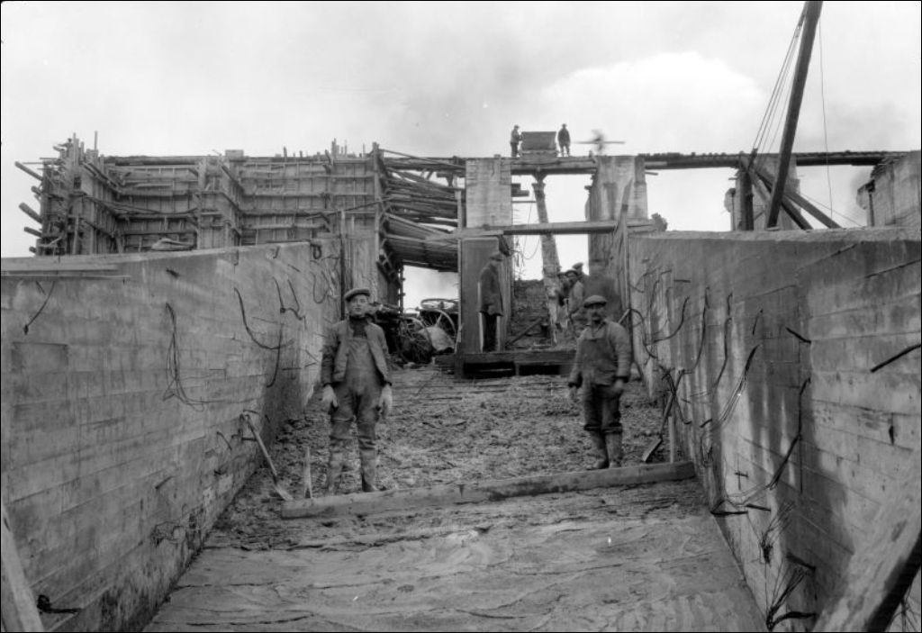 Lac Kénogami, construction des barrages Pibrac et des digues: Barrage Portage-des-Roches, plancher de la chute à billots, 1923, Archives nationales à Québec, Fonds Ministère de l'Environnement et de la Lutte contre les changements climatiques, (03Q,E57,S44,SS1,D78,PA4-22), Photographe non identifié.