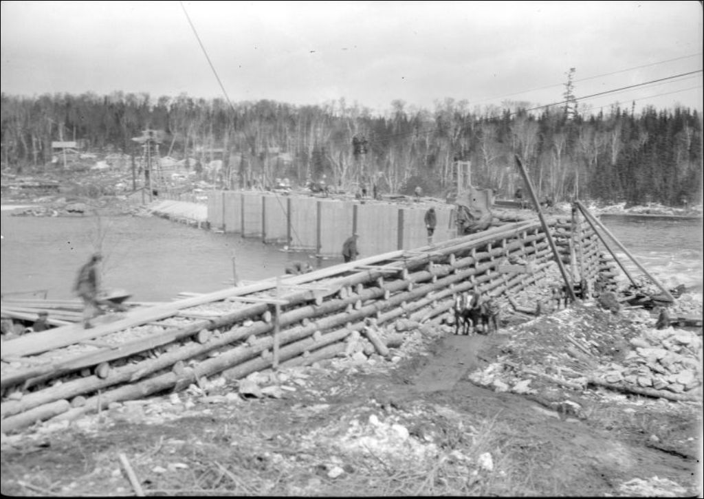 Construction du réservoir Cabonga sur la rivière Gatineau: Barrage sur la rivière Gens de Terre, 1929, Archives nationales à Québec, Fonds Ministère de l'Environnement et de la Lutte contre les changements climatiques, (03Q,E57,S44,SS1,D91,PA5-49), Photographe non identifié.