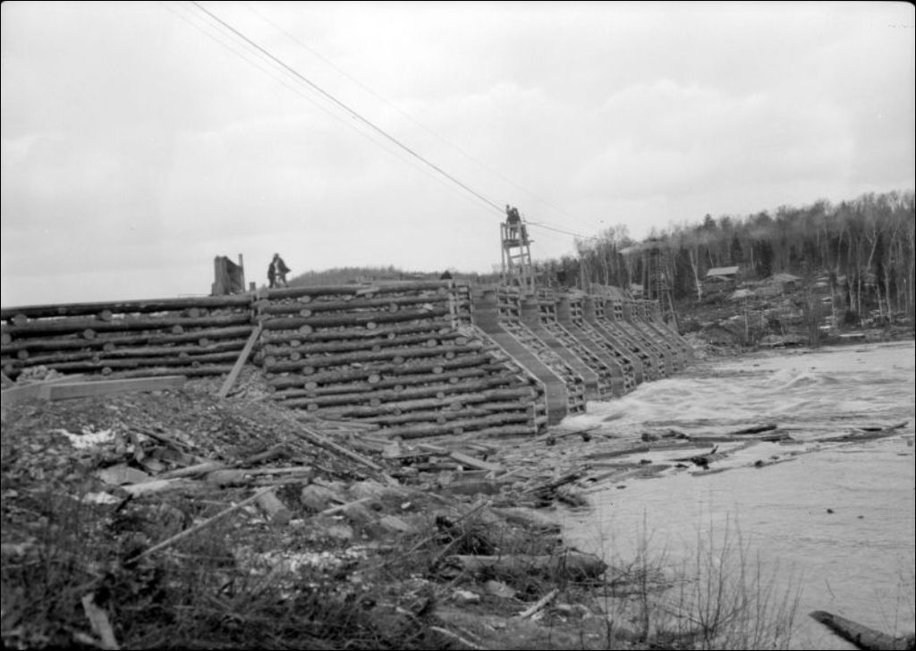 Construction du réservoir Cabonga sur la rivière Gatineau: Barrage sur la rivière Gens de Terre, 1929, Archives nationales à Québec, Fonds Ministère de l'Environnement et de la Lutte contre les changements climatiques, (03Q,E57,S44,SS1,D91,PA5-50), Photographe non identifié.