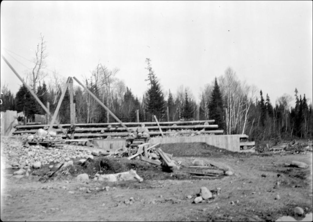 Construction du réservoir Cabonga sur la rivière Gatineau: Barrage sur la rivière Gens de Terre, 1929, Archives nationales à Québec, Fonds Ministère de l'Environnement et de la Lutte contre les changements climatiques, (03Q,E57,S44,SS1,D91,PA5-54), Photographe non identifié.