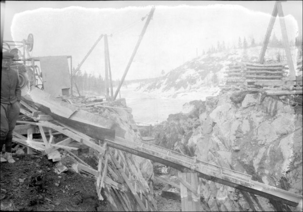 Lac Kénogami, construction des barrages Pibrac et des digues: Pibrac-Est, canal de dérivation, 1924, Archives nationales à Québec, Fonds Ministère de l'Environnement et de la Lutte contre les changements climatiques, (03Q,E57,S44,SS1,D78,PA6-32), Photographe non identifié.
