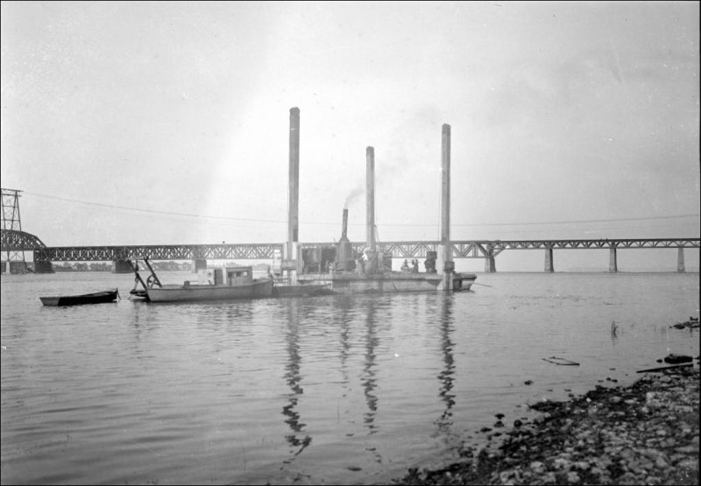 Caughnawaga (Kahnawake); chaland sur le Fleuve Saint-Laurent, 1931, Archives nationales à Québec, Fonds Ministère de l'Environnement et de la Lutte contre les changements climatiques, (03Q,E57,S44,SS1,D90,PA6-81), Photographe non identifié.