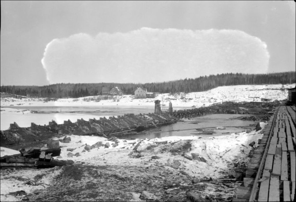 Lac Kénogami, construction des barrages Pibrac et des digues: Barrage Portage-des-Roches, vue en aval de la vieille écluse