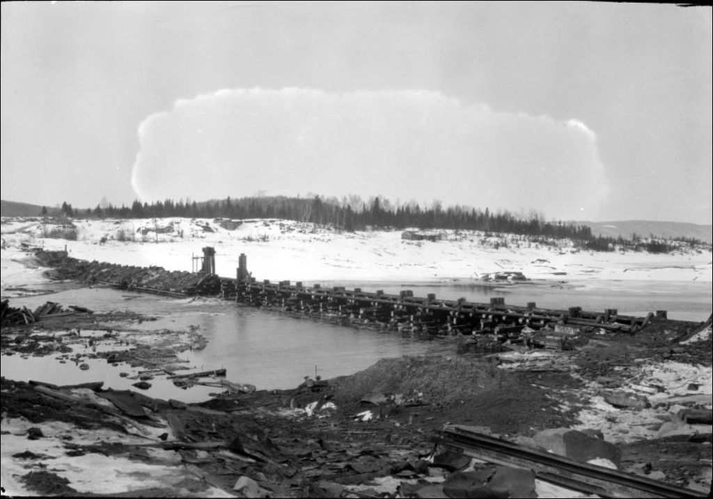 Lac Kénogami, construction des barrages Pibrac et des digues: Barrage Portage-des-Roches, vue en aval de la vieille écluse, 1924, Archives nationales à Québec, Fonds Ministère de l'Environnement et de la Lutte contre les changements climatiques, (03Q,E57,S44,SS1,D78,PA7-22), Photographe non identifié.
