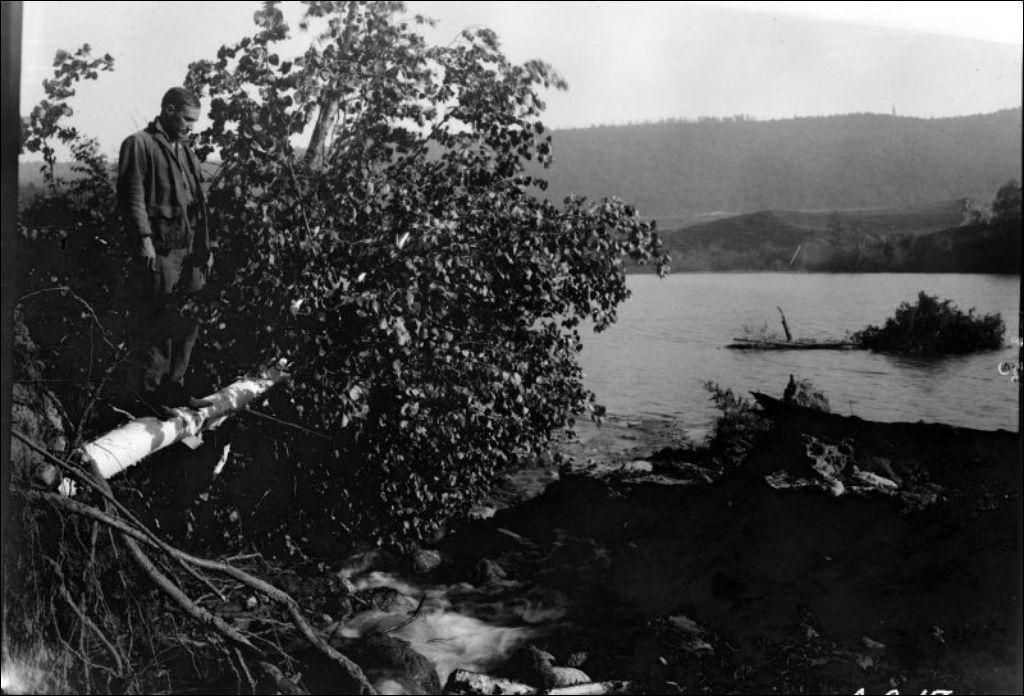 Lac Louis situé à l'extrémité ouest du Lac Kénogami, vue d'un éboulis sur les berges, 1924, Archives nationales à Québec, Fonds Ministère de l'Environnement et de la Lutte contre les changements climatiques, (03Q,E57,S44,SS1,D82,PA8-17), Photographe non identifié.