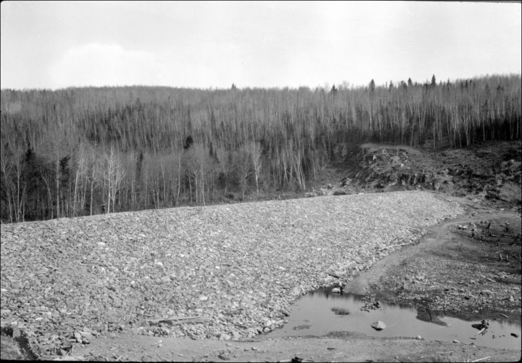 Lac Kénogami, construction des barrages Pibrac et des digues: digue de la baie de Moncouche, 1924, Archives nationales à Québec, Fonds Ministère de l'Environnement et de la Lutte contre les changements climatiques, (03Q,E57,S44,SS1,D78,PA8-41), Photographe non identifié.