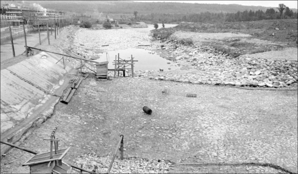 Rivière Magog - Barrage de la Dominion Textile Co.: canal en aval du barrage, 1922, Archives nationales à Québec, Fonds Ministère de l'Environnement et de la Lutte contre les changements climatiques, (03Q,E57,S44,SS1,D144,PB11-16), Photographe non identifié.