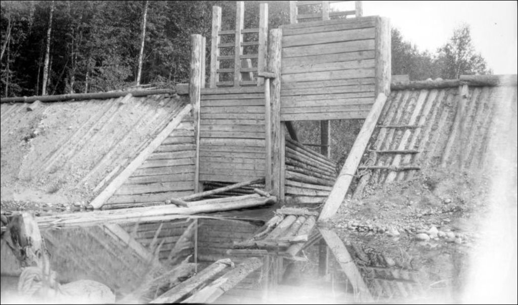 Rivière Shipshaw: la rivière Jim Gray, première écluse, 1929, Archives nationales à Québec, Fonds Ministère de l'Environnement et de la Lutte contre les changements climatiques, (03Q,E57,S44,SS1,D157,PB19-65), Photographe non identifié.