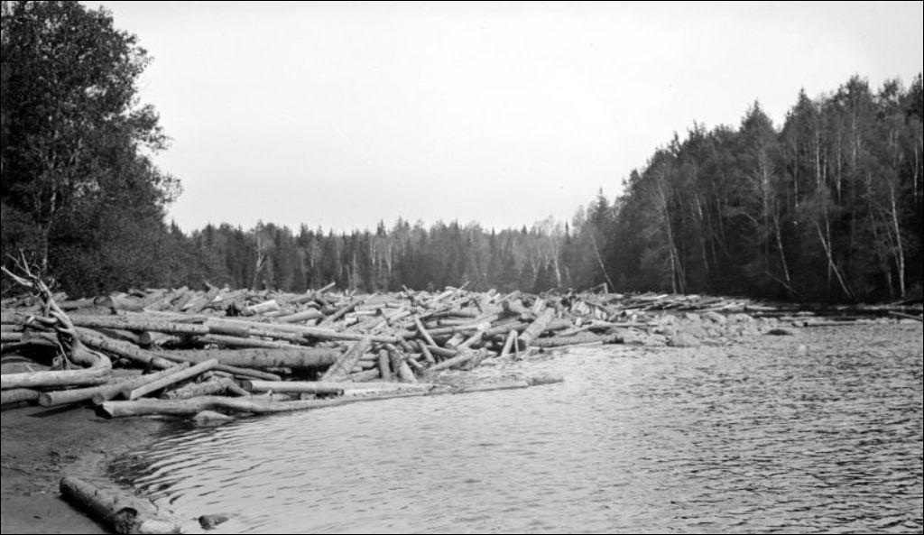 Flottage du bois sur la rivière Manouane, 1931, Archives nationales à Québec, Fonds Ministère de l'Environnement et de la Lutte contre les changements climatiques, (03Q,E57,S44,SS1,D151,PB20-71), Photographe non identifié.