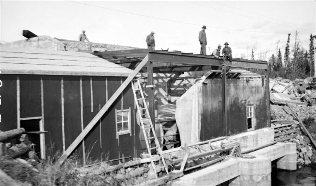 Construction de l'usine hydro-électrique de La Loutre sur la Rivière Saint-Maurice, 1931, Archives nationales à Québec, Fonds Ministère de l'Environnement et de la Lutte contre les changements climatiques, (03Q,E57,S44,SS1,D76,PB21-84), Photographe non identifié.
