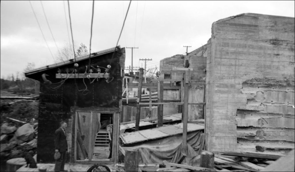 Construction de l'usine hydro-électrique de La Loutre sur la Rivière Saint-Maurice, 1931, Archives nationales à Québec, Fonds Ministère de l'Environnement et de la Lutte contre les changements climatiques, (03Q,E57,S44,SS1,D76,PB21-87), Photographe non identifié.