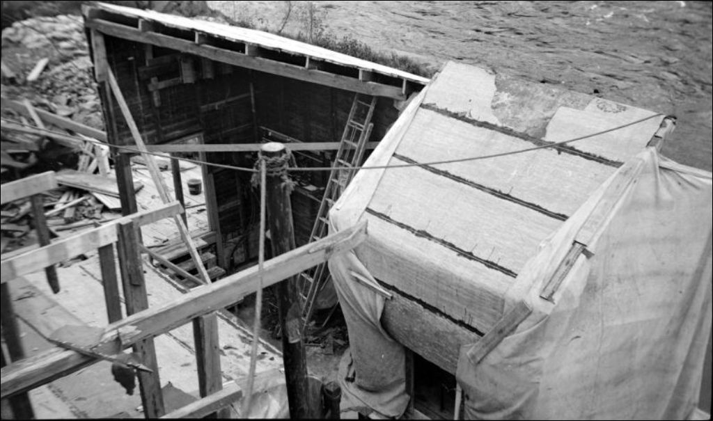 Construction de l'usine hydro-électrique de La Loutre sur la Rivière Saint-Maurice, 1931, Archives nationales à Québec, Fonds Ministère de l'Environnement et de la Lutte contre les changements climatiques, (03Q,E57,S44,SS1,D76,PB21-88), Photographe non identifié.