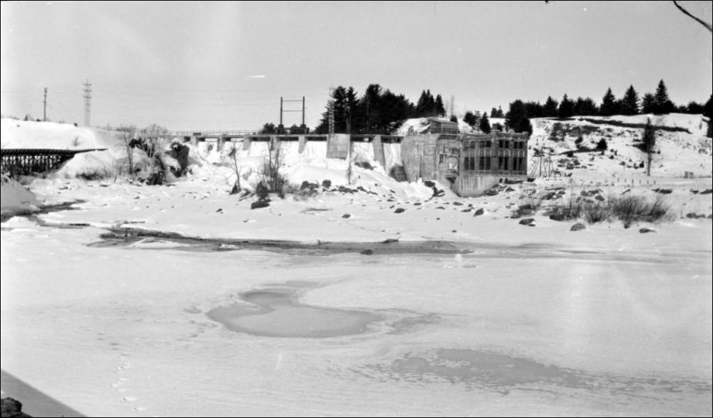 Rivière Ouareau: glace près du barrage et de l'usine de la Gatineau Power à la chute Magnan à Rawdon