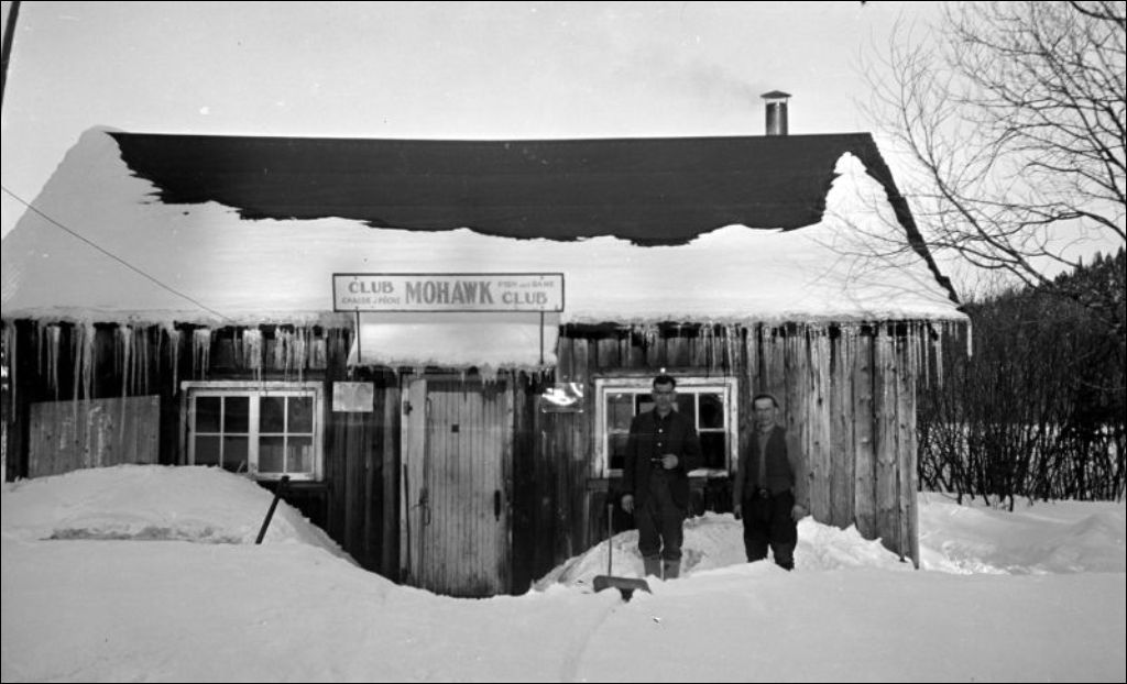 Rivière Batiscan: Mohawk Club, on remarque Johnny Perron près d'une pelle, 1933, Archives nationales à Québec, Fonds Ministère de l'Environnement et de la Lutte contre les changements climatiques, (03Q,E57,S44,SS1,D193,PB26-54), Photographe non identifié.