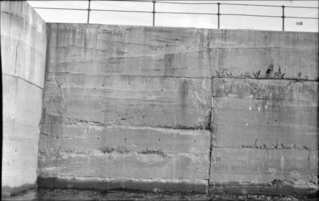 Barrage Gouin: dégradation du béton, 1934, Archives nationales à Québec, Fonds Ministère de l'Environnement et de la Lutte contre les changements climatiques, (03Q,E57,S44,SS1,D76,PB34-33), Photographe non identifié.