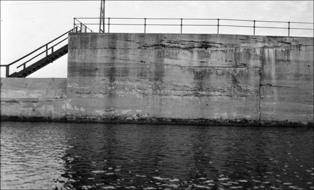 Barrage Gouin: dégradation du béton, 1934, Archives nationales à Québec, Fonds Ministère de l'Environnement et de la Lutte contre les changements climatiques, (03Q,E57,S44,SS1,D76,PB34-40), Photographe non identifié.