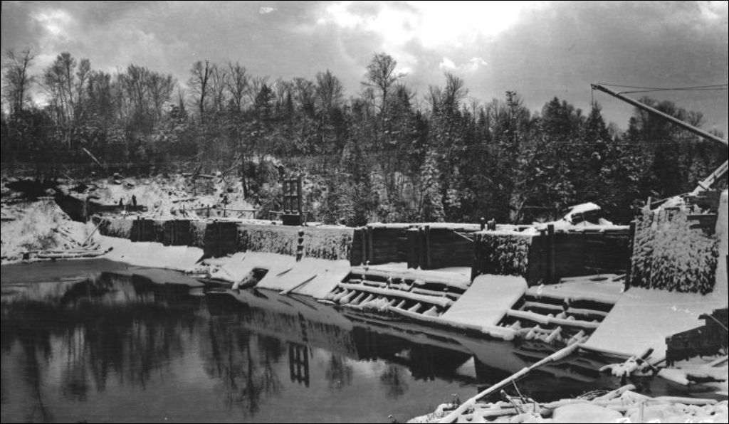 Lac Saint-François: Vue en amont du barrage en bois de Weedon, 1914, Archives nationales à Québec, Fonds Ministère de l'Environnement et de la Lutte contre les changements climatiques, (03Q,E57,S44,SS1,D93,PB3-45), Photographe non identifié.