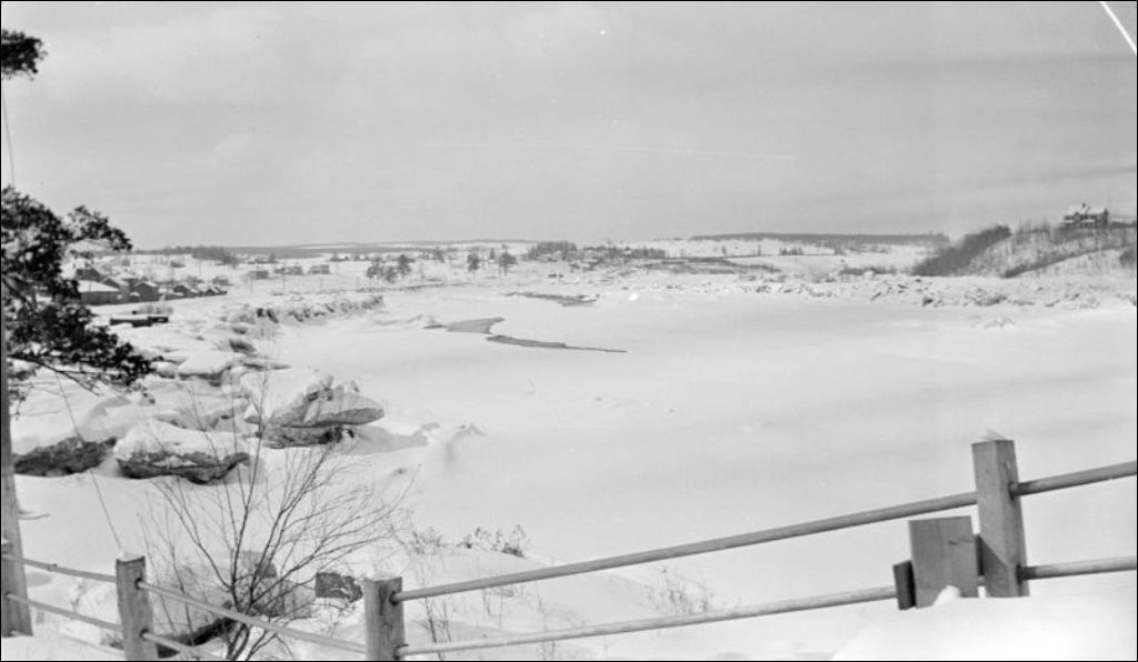 Rivière Saint-François à Bromptonville: vue aval à la sortie du pont-route, 1935, Archives nationales à Québec, Fonds Ministère de l'Environnement et de la Lutte contre les changements climatiques, (03Q,E57,S44,SS1,D96,PB35-12), Photographe non identifié.