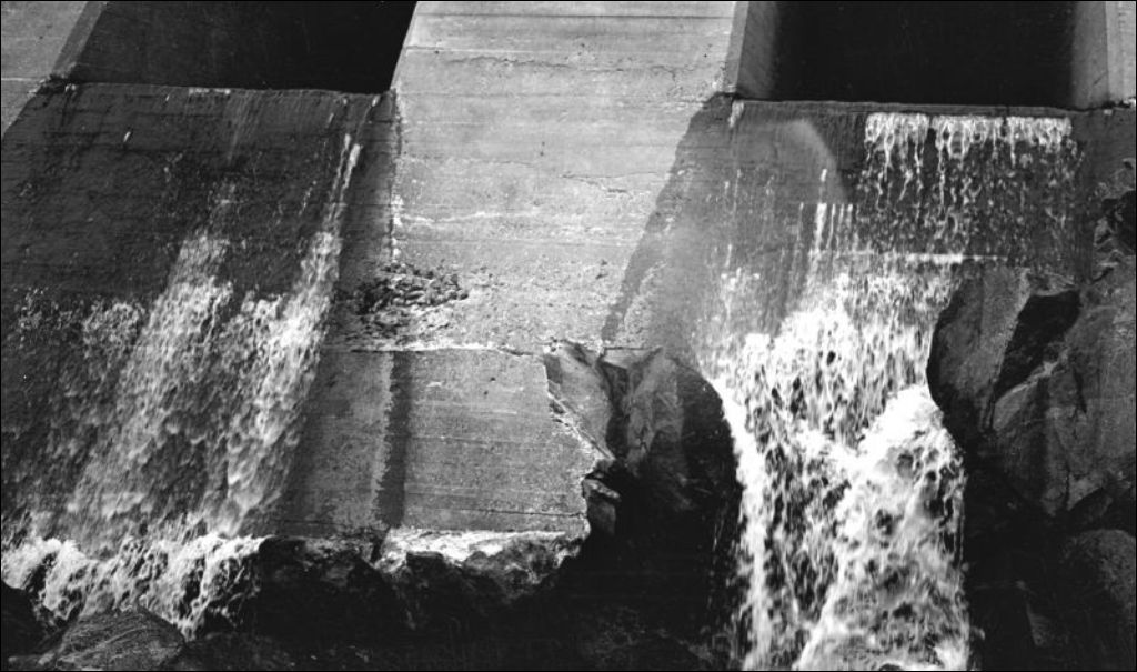Rivière Gatineau, réservoir Baskatong: érosion et désagrégation au Barrage Mercier, 1935, Archives nationales à Québec, Fonds Ministère de l'Environnement et de la Lutte contre les changements climatiques, (03Q,E57,S44,SS1,D91,PB36-75), Photographe non identifié.