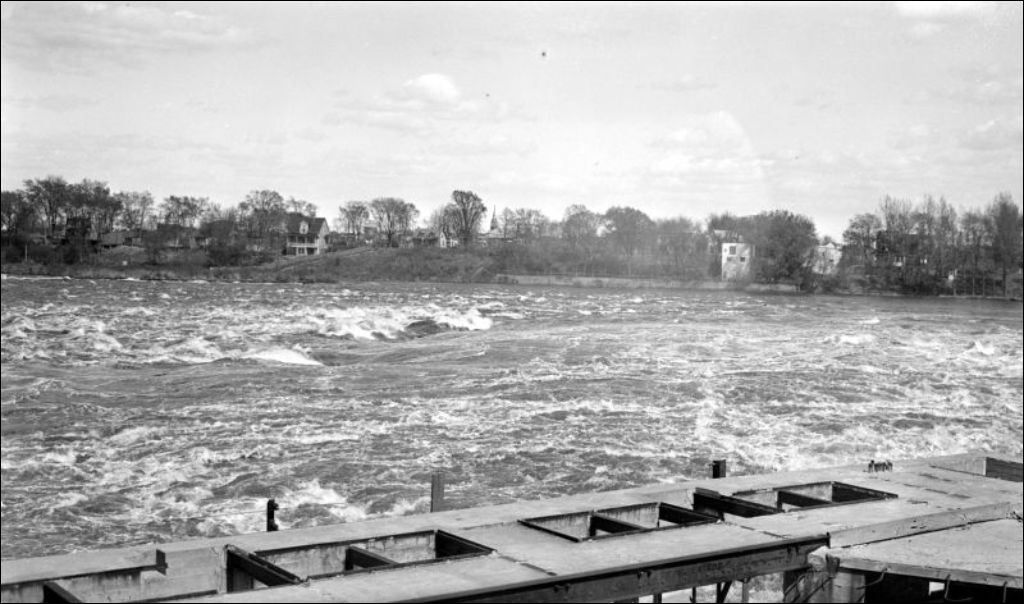 Rivière des Prairies: vue de la rivière en aval des déverspirs du barrage de la M.I.P. Co. à Saint-Vincent-de-Paul