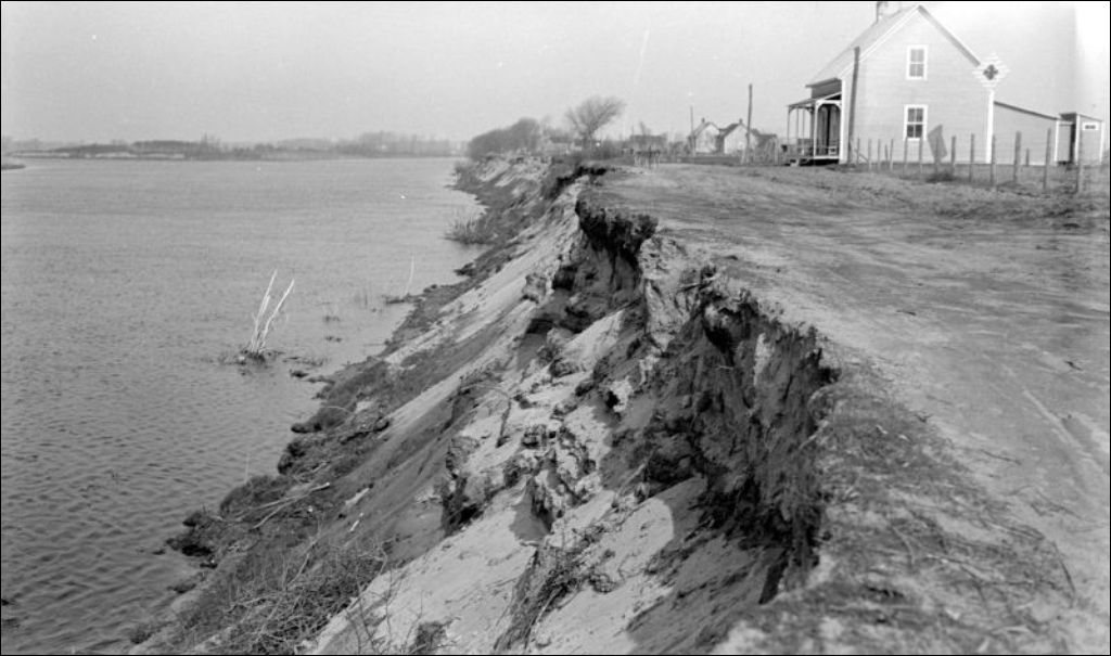 Rivière Saint-François : érosion à Notre-Dame-de-Pierreville, 1936, Archives nationales à Québec, Fonds Ministère de l'Environnement et de la Lutte contre les changements climatiques, (03Q,E57,S44,SS1,D96,PB41-76), Photographe non identifié.