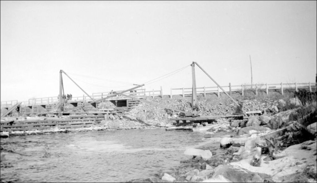 Lac Aylmer: enrochement au barrage, 1937, Archives nationales à Québec, Fonds Ministère de l'Environnement et de la Lutte contre les changements climatiques, (03Q,E57,S44,SS1,D104,PB42-69), Photographe non identifié.