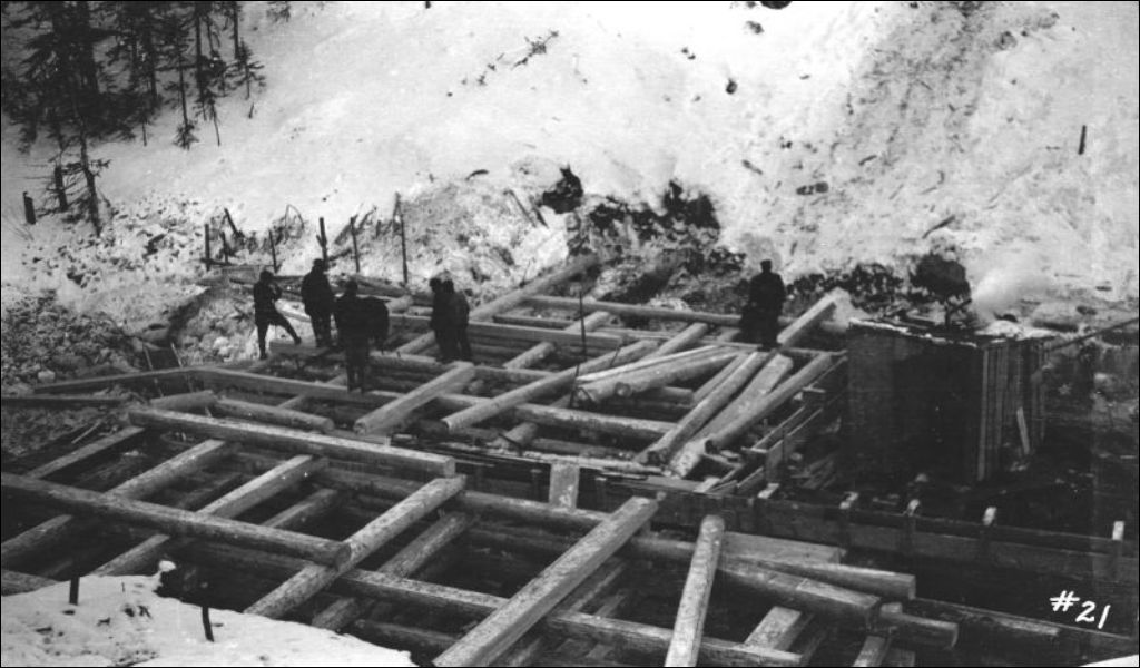 Lac Brûlé, construction du barrage: charpente regardant le sud
