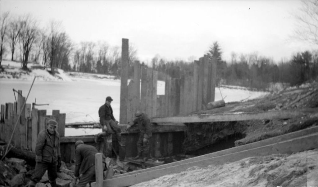 Rivière Moose: construction du barrage d'Acton Vale, 1939, Archives nationales à Québec, Fonds Ministère de l'Environnement et de la Lutte contre les changements climatiques, (03Q,E57,S44,SS1,D241,PB45-88), Photographe non identifié.