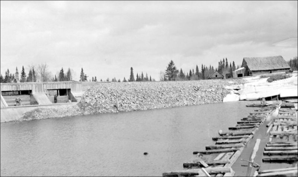 Rivière Mitis: barrage du lac Mitis, 1938, Archives nationales à Québec, Fonds Ministère de l'Environnement et de la Lutte contre les changements climatiques, (03Q,E57,S44,SS1,D152,PB46-77), Photographe non identifié.