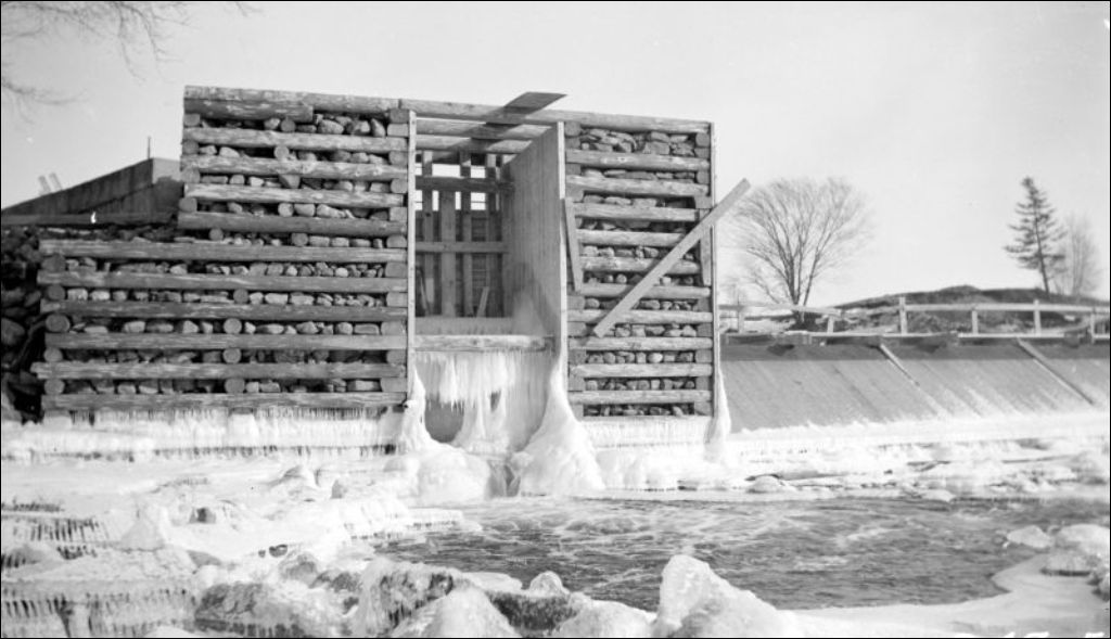 Rivière Noire: reconstruction du barrage à Upton, 1939, Archives nationales à Québec, Fonds Ministère de l'Environnement et de la Lutte contre les changements climatiques, (03Q,E57,S44,SS1,D172,PB47-5), Photographe non identifié.