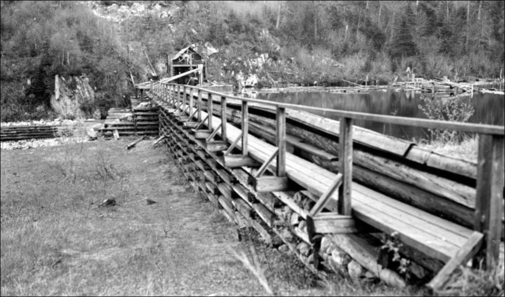 Rivière Mistigougèche: barrage des Eaux Mortes, 1940, Archives nationales à Québec, Fonds Ministère de l'Environnement et de la Lutte contre les changements climatiques, (03Q,E57,S44,SS1,D249,PB49-27), Photographe non identifié.