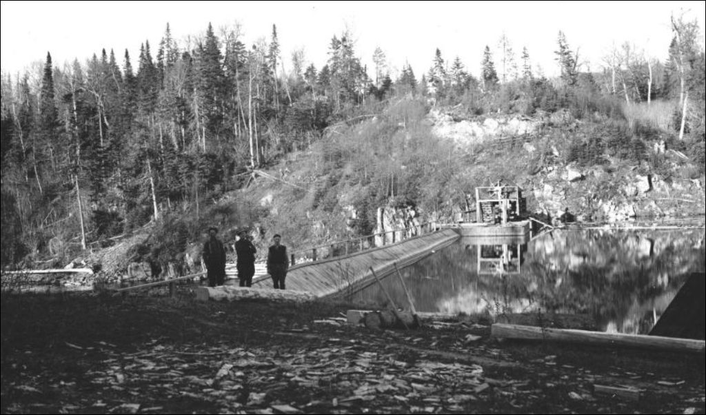 Rivière Mistigougèche: barrage des Eaux Mortes, 1940, Archives nationales à Québec, Fonds Ministère de l'Environnement et de la Lutte contre les changements climatiques, (03Q,E57,S44,SS1,D249,PB49-28), Photographe non identifié.