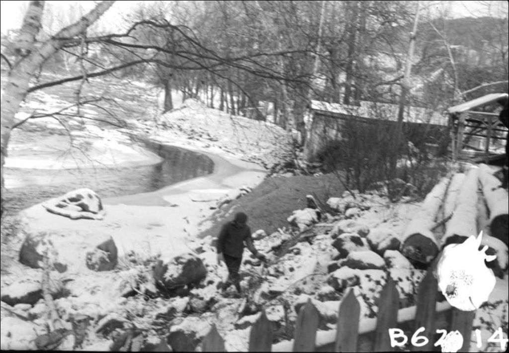 Rivière Ouelle: enrochement à Saint-Pacôme, 1943, Archives nationales à Québec, Fonds Ministère de l'Environnement et de la Lutte contre les changements climatiques, (03Q,E57,S44,SS1,D227,PB62-14), Photographe non identifié.