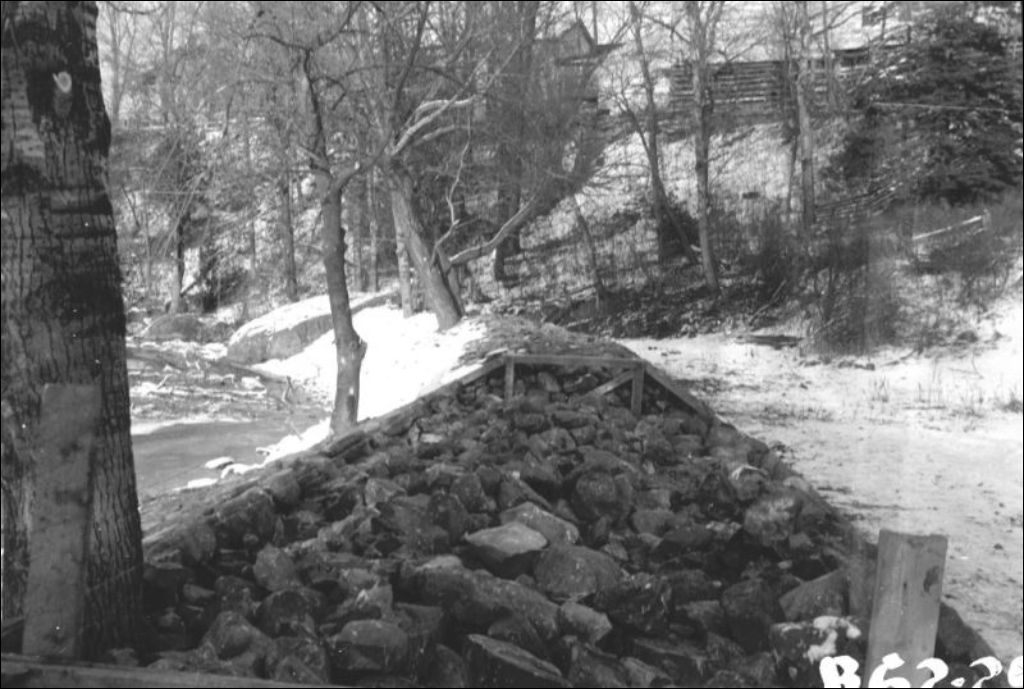 Rivière Ouelle: enrochement à Saint-Pacôme, 1943, Archives nationales à Québec, Fonds Ministère de l'Environnement et de la Lutte contre les changements climatiques, (03Q,E57,S44,SS1,D227,PB62-29), Photographe non identifié.