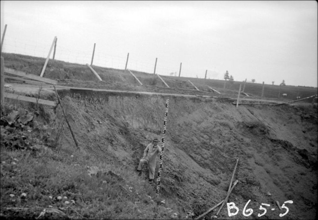 Rivière Saint-Zéphirin: éboulis, 1947, Archives nationales à Québec, Fonds Ministère de l'Environnement et de la Lutte contre les changements climatiques, (03Q,E57,S44,SS1,D299,PB65-5), Photographe non identifié.