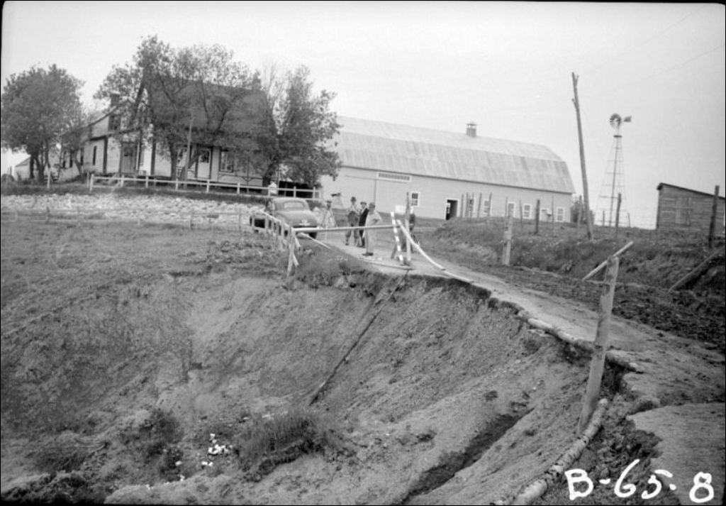 Rivière Saint-Zéphirin: éboulis, 1947, Archives nationales à Québec, Fonds Ministère de l'Environnement et de la Lutte contre les changements climatiques, (03Q,E57,S44,SS1,D299,PB65-8), Photographe non identifié.