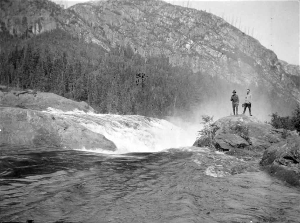 Rivière Betsiamites: premier saut des premières chutes, 1920, Archives nationales à Québec, Fonds Ministère de l'Environnement et de la Lutte contre les changements climatiques, (03Q,E57,S44,SS1,D313,PC1-89), Photographe non identifié.