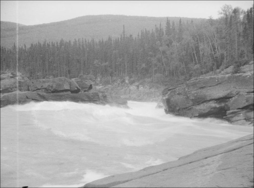 Rivière Betsiamites: deuxième chute, 1920, Archives nationales à Québec, Fonds Ministère de l'Environnement et de la Lutte contre les changements climatiques, (03Q,E57,S44,SS1,D313,PC1-99), Photographe non identifié.