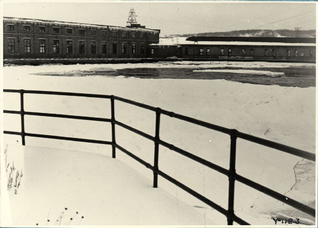 Rivière Saint-Maurice - Shawinigan Falls - Glace - Ice progress at Shawinigan Falls gateshouses, 19 février 1935, Archives nationales à Québec, Fonds Ministère de l'Environnement et de la Lutte contre les changements climatiques, (03Q,E57,S44,SS1,D76,PY-1123), Photographe non identifié.