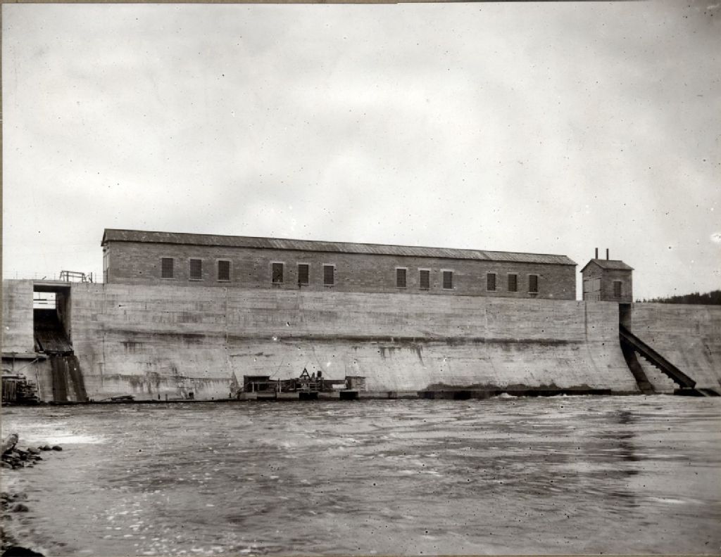 Rivière Saint-Maurice, Barrage Gouin - Vue aval du Gate House à glissoire à billots, 1923, Archives nationales à Québec, Fonds Ministère de l'Environnement et de la Lutte contre les changements climatiques, (03Q,E57,S44,SS1,D76,PY-205), Photo Dufresne.